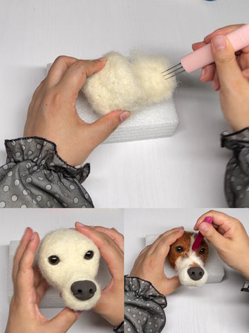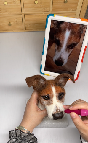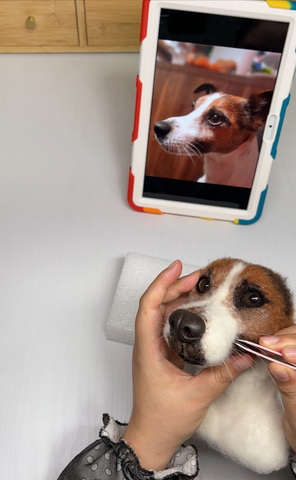 Choosing the right wool colors and textures was crucial. Moritz’s portrait required a blend of white, gray, and brown wools to capture his distinct markings and soft fur.
