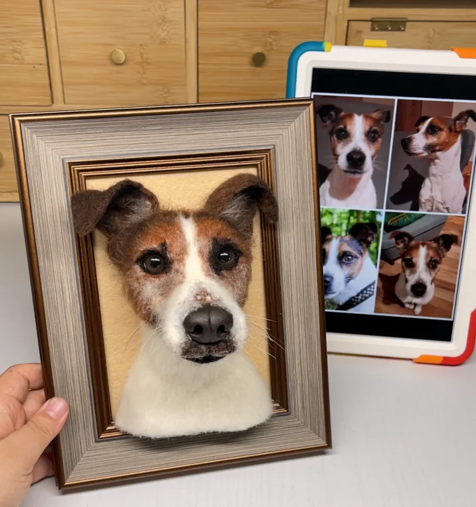 Choosing the right wool colors and textures was crucial. Moritz’s portrait required a blend of white, gray, and brown wools to capture his distinct markings and soft fur.